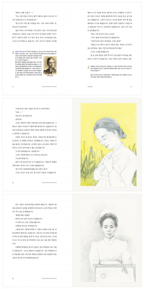 이 책은 우리나라 간호사의 첫걸음이었던 김마르다 이야기입니다. 김마르다는 정동에 있던 최초 여성전문병원인 보구여관에서 허드렛일을 하며 지내다가 선교 간호사들이 세운 간호원양성학교 초대 졸업생이 됩니다. 우리나라에서 최초의 예모식이 열린 것입니다.
