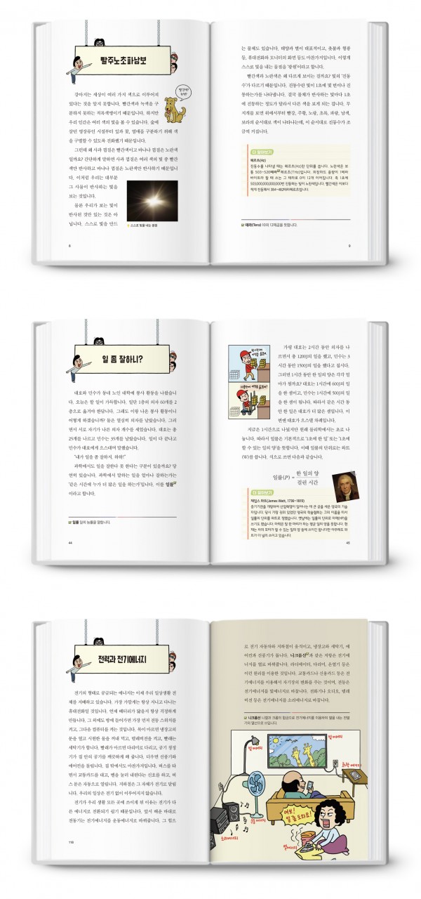 이 책 1장은 보고 듣기입니다. 눈으로 볼 수 있는 사물, 빛, 소리의 성질을 말합니다. 물리의 기초 중의 기초입니다. 이러한 현상(우리가 인지하는 다양한 현상들)을 모르고 물리를 할 수는 없으니까요. 2장은 다양한 에너지들 이야기입니다. 우리가 실제 많은 곳에서 사용하는 원리들입니다. 모르면 그냥 지나칠 것들이지만 알고 보면 곳곳에 이런 원리들이 우리의 삶을 편리하게 해주고 있습니다.